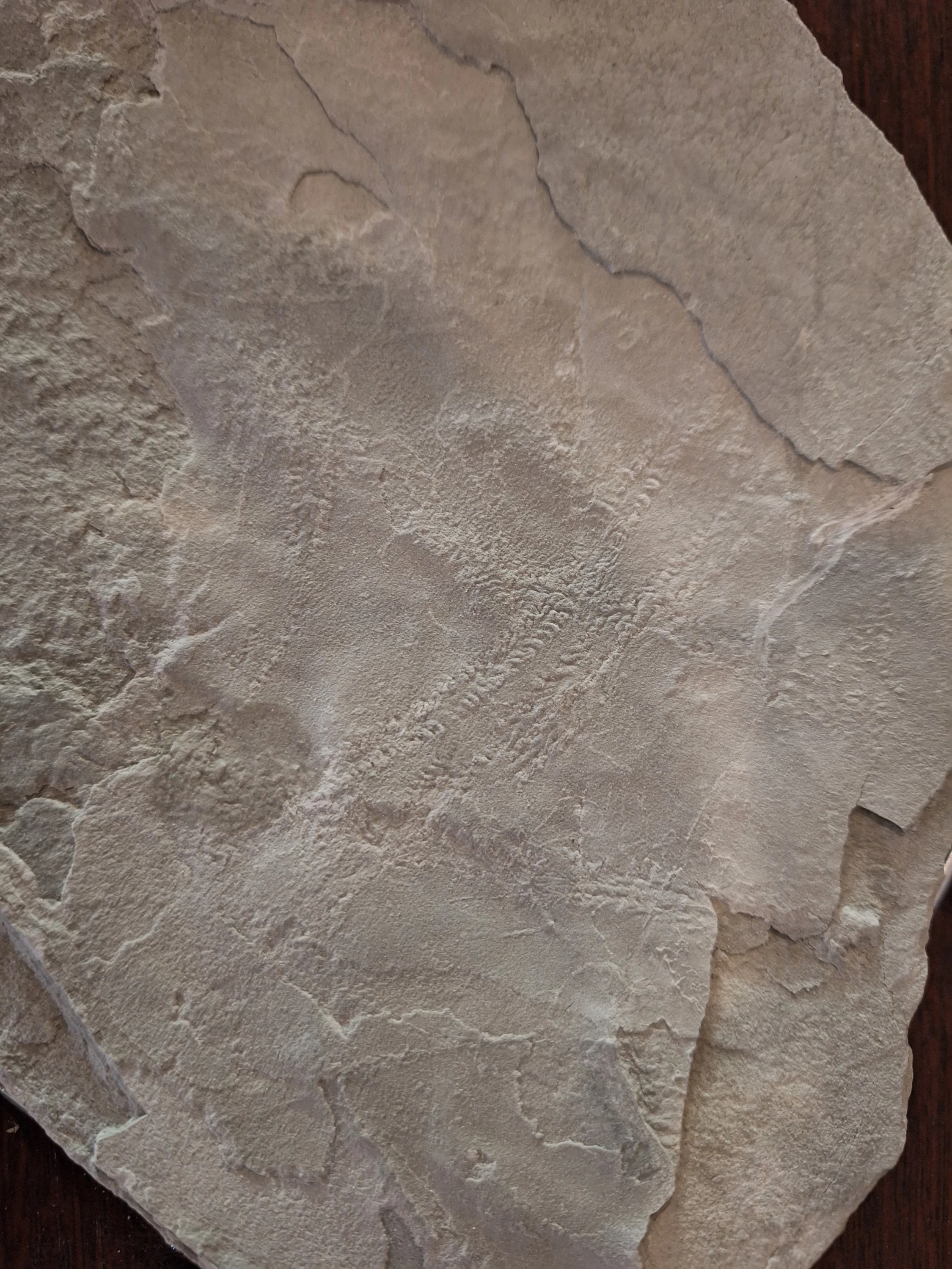 Zdjęcie szarej skały iłowca, w który zostały znalezione skamieniałości z końca triasu.