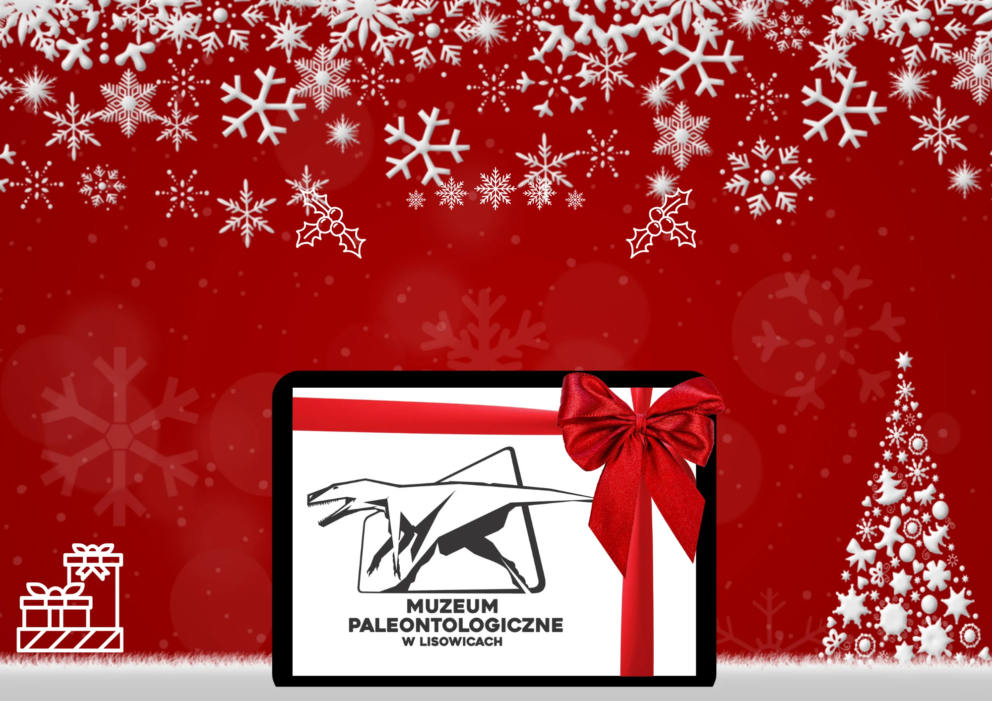 Plakat z okazji Świąt Bożego Narodzenia. Logo Muzeum Paleontologicznego w Lisowicach jako prezent z czerwoną kokardą. Czerwone tło z białymi płatkami śniegu i białymi grafikami małych prezentów i choinki.