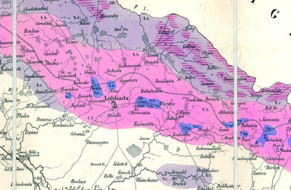 Na fundamencie skał prekambryjskich i paleozoicznych wykształciła się osadowa pokrywa mezozoiczna Ziemi Lublinieckiej, która jest wieku głównie triasowego i obejmuje wapienie (na mapie kolor fioletowy) oraz iły/ iłowce (kolor różowy). Skały w rejonie Zborowskiego, Lisowa i Boronowa wykazują wiek jurajski i są to także iły/ iłowce, miejscami bogate w żelazo. Pierwszą mapę geologiczną tego obszaru sporządził Rudolf von Carnall w 1844 r. na zlecenie króla Prus.