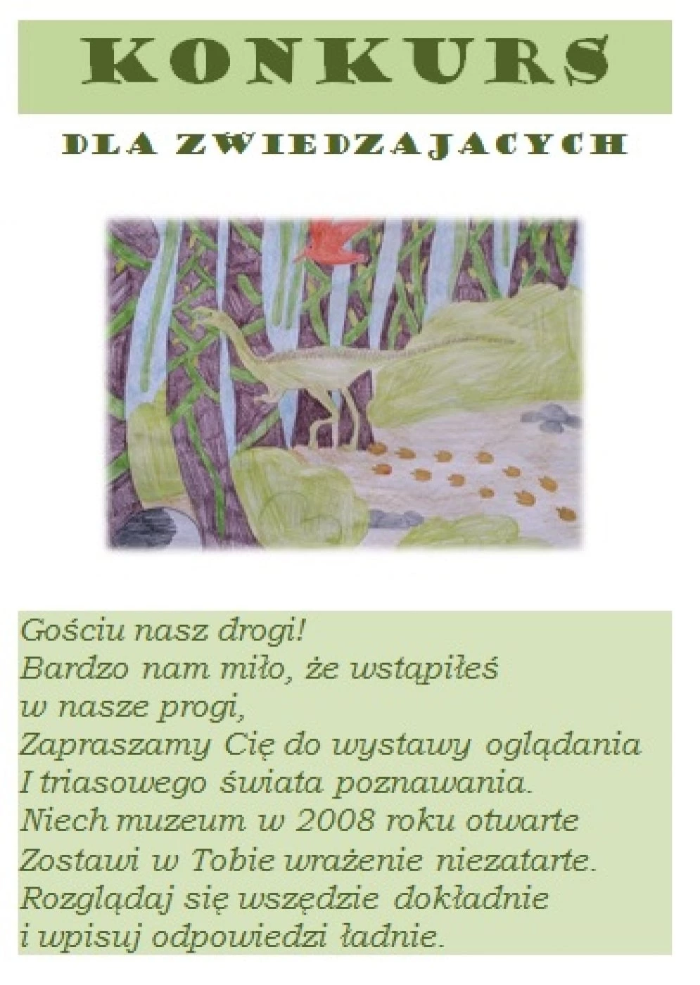 Od początku lipca do końca września trwał konkurs dla osób zwiedzających nasze Muzeum. Mógł w nim wziąć udział każdy, kto przestąpił próg naszej placówki. Oglądając wystawę, należało poszukać odpowiedzi na kilka pytań dotyczących eksponatów znajdujących się w naszym Muzeum. Drobne upominki prześlemy osobom, wylosowanym spośród tych, które bezbłędnie odpowiedziały na 7 pytań zawartych w quizie. Są to: Paulina i Ewelina Irek, Zosia Niećko, Karol Jaworski, Izabela Niewiadomska, Marcel Baron, Mikołaj Śleziak. Gratulujemy, dziękujemy za udział w zabawie i zapraszamy ponownie do Muzeum Paleontologicznego w Lisowicach.