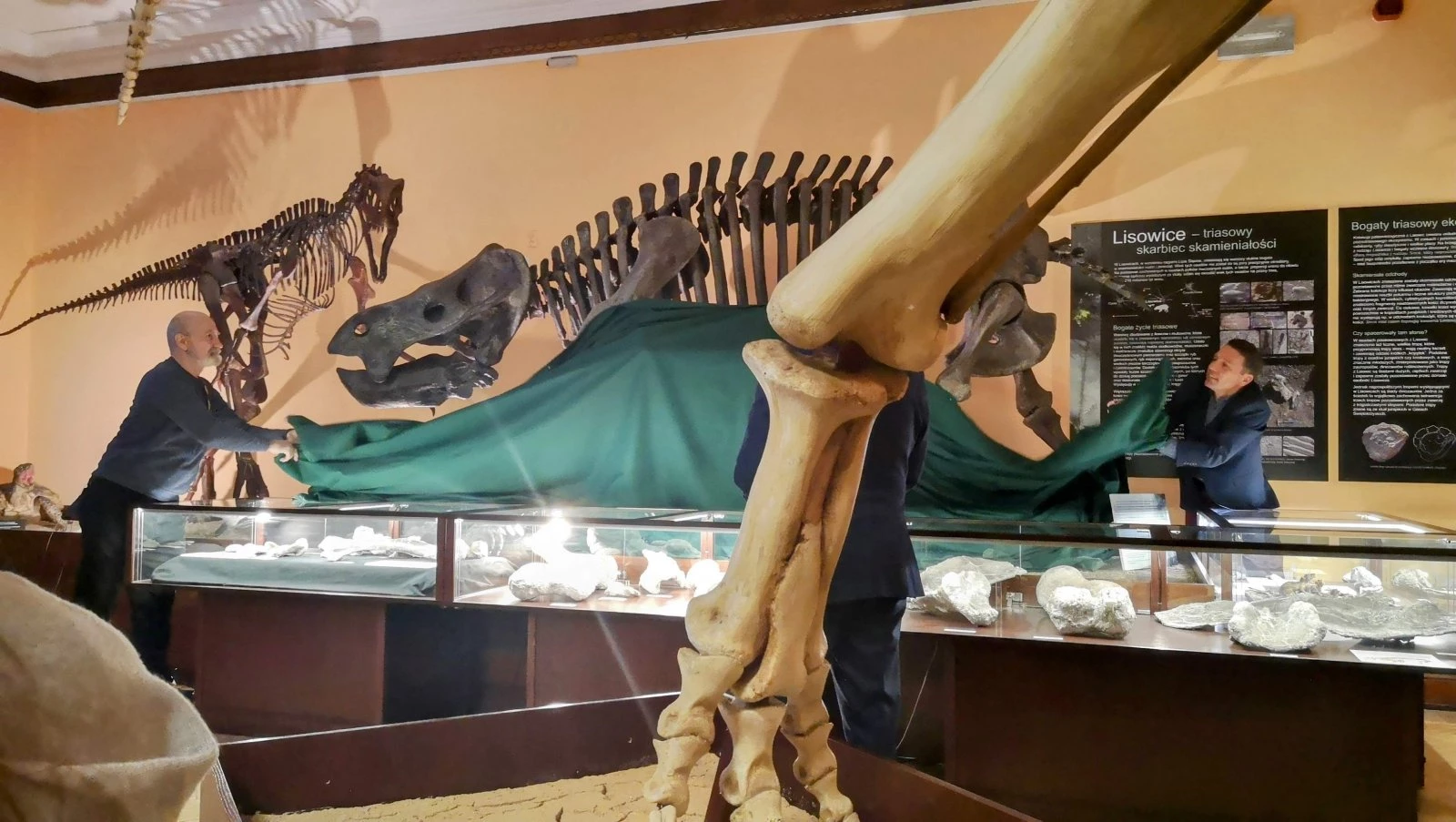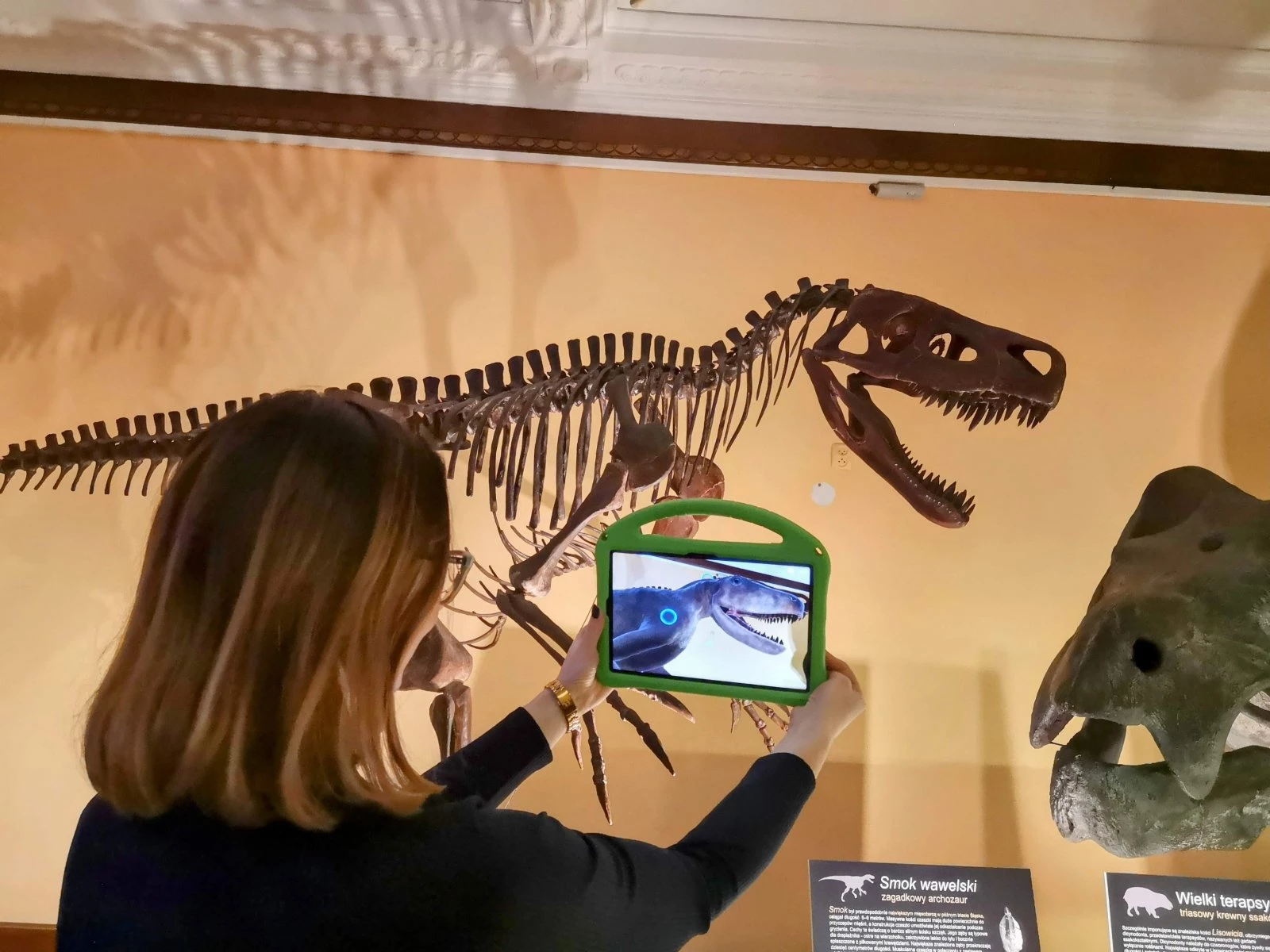 Zdjęcie rzeźby szkieletu dinozaura nazwanego Smok wawelski. Przed nim tablet.Zdjęcie przedstawiające od lewej Pan Marka Błyszcza, Martę Szubert i Annę Majowską.Zdjęcie z otwarcia odnowionej wystawy skamieniałości z Lisowic. Kamerzysta kręcący wypowiedź Dyrektor Instytutu Paleobiologii w Warszawie. W tle szkielet dinozaura.Zdjęcie odsłonięcia nowego szkieletu dicynodonta zwanego Lisowicia bojani.Zdjęcie z prezentacji dr Grzegorza Niedźwiedzkiego.Zdjęcie wystawy w Muzeum Ewolucji. W tle stoją modele szkieletów lisowicji i smoka. Z przodu stoi od lewej: Marek Błyszcz, Tomasz Sulej i Anna Majowska.Zdjęcie. Kobieta trzyma przed sobą tablet i ogląda dinozaura w ciele przykładając go do szkieletu dinozaura nazwanego Smok wawelski.