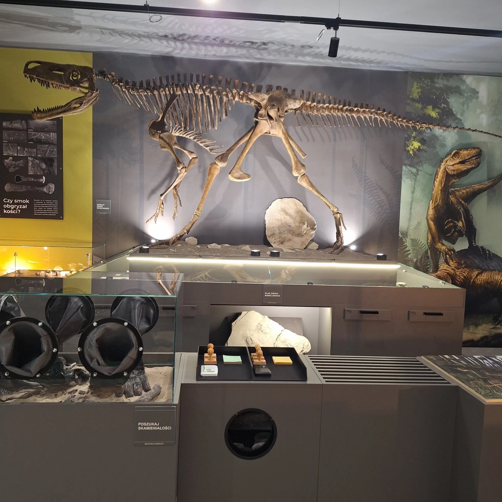 Zdjęcie rzeźby szkieletu dinozaura nazwanego Smok wawelski, poniżej piaskownica paleontologiczna pod szklaną pokrywą z rękawicami, miejsce na pieczątki i puzzle, po prawej fotościanka z tym samym dinozaurem.